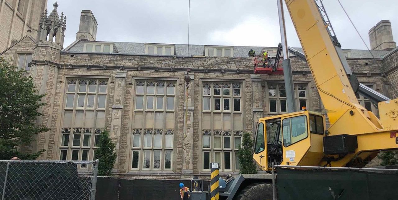 Having been constructed during the COVID-19 pandemic, material shortages were ongoing, and the team had to follow strict CDC guidelines with being on an active campus. During the summer months, heat exposure was a major safety concern. PULLMAN had a designated crew to supply water to the team at all times and fetched tools and equipment so they wouldn’t have to leave their work area. Quality of work was especially crucial due to the building’s historic structure, which added to the challenges of the project. Each mason had to be pre-approved by the architect prior to performing any masonry restoration work. This approval process involved exhibiting competent skills in raking, repointing, cleaning, and crack injection among other restoration skills. The project team also had close coordination with Prost Builders and the University to keep students safe by providing protection and sequencing of work while not impacting normal campus operations.