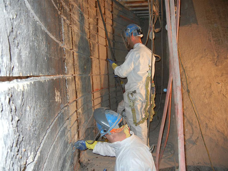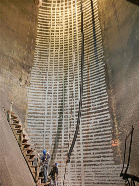 The project began with a single contract with PULLMAN and STRUCTURAL TECHNOLOGIES to perform a comprehensive inspection and evaluation. PULLMAN performed inspections at night, when coal was not being fed to other unit silos, and during scheduled individual outages to ensure power generation was not unnecessarily interrupted. Inspection services included: ground penetrating radar, echo impact, crack mapping, core sample testing and visual observation. STRUCTURAL TECHNOLOGIES provided some Non-Destructive Evaluations (NDE) to verify the as-built silo condition. PULLMAN then compared the as-built condition against the current codes to determine if a repair was required.