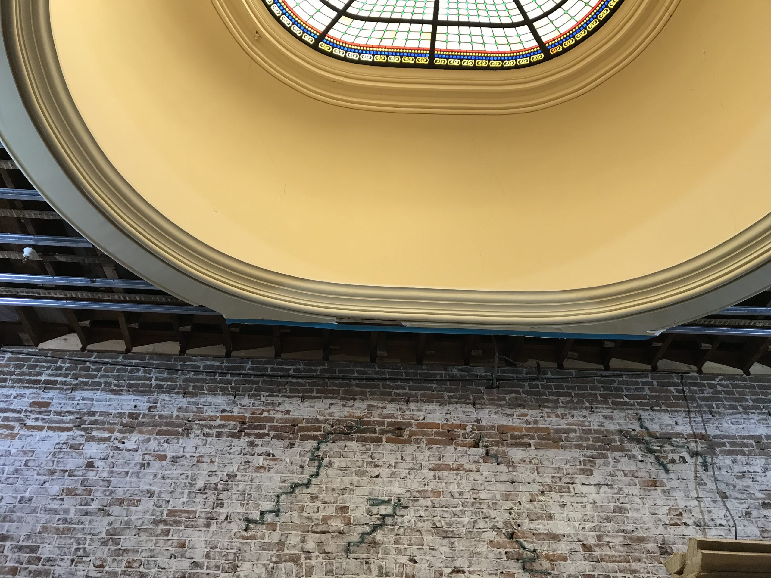 The Courthouse suffered damage after a 6.0 magnitude earthquake struck the region. The load bearing masonry walls, plaster, and wood trims exhibited severe damage. Shear cracks ran through many of the exterior and interior walls, coupled with diagonal cracking through many of the window spandrels. A gaping hole was visible at the southeast corner roofline, and portions of the interior walls were in danger of collapsing.