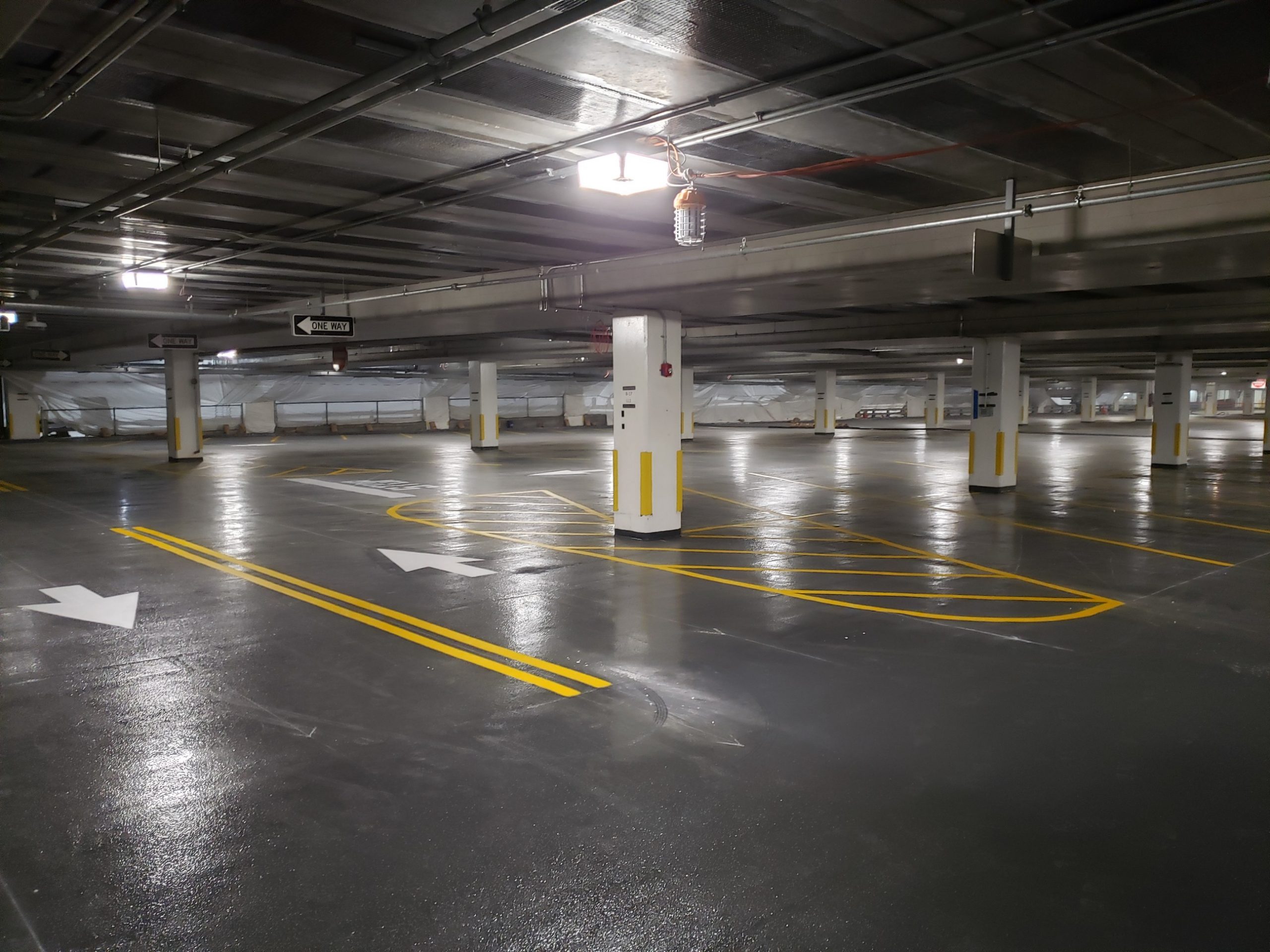 The Design Engineer and the EOR was assisted by STRUCTURAL TECHNOLOGIES to complete the initial investigation and engineering design. Once accomplished, PULLMAN was contracted to perform the structural repairs. The scope of work included slab replacement on the elevated concrete deck, expansion joints installation, slab strengthening, waterproofing, as well as an extensive electrical system upgrade. Six sections of concrete slabs were replaced in their entirety due to extensive cracking. In addition, as an exclusive licensee of STRUCTURAL TECHNOLOGIES, PULLMAN was able to apply approximately 100,000 SF of V-Wrap™ to strengthen the structure. Crews applied a traffic bearing membrane to 200,000 SF on the elevated concrete decks. Additional scope included fire alarm and sprinkler system redesign and carbon monoxide detection system installation.