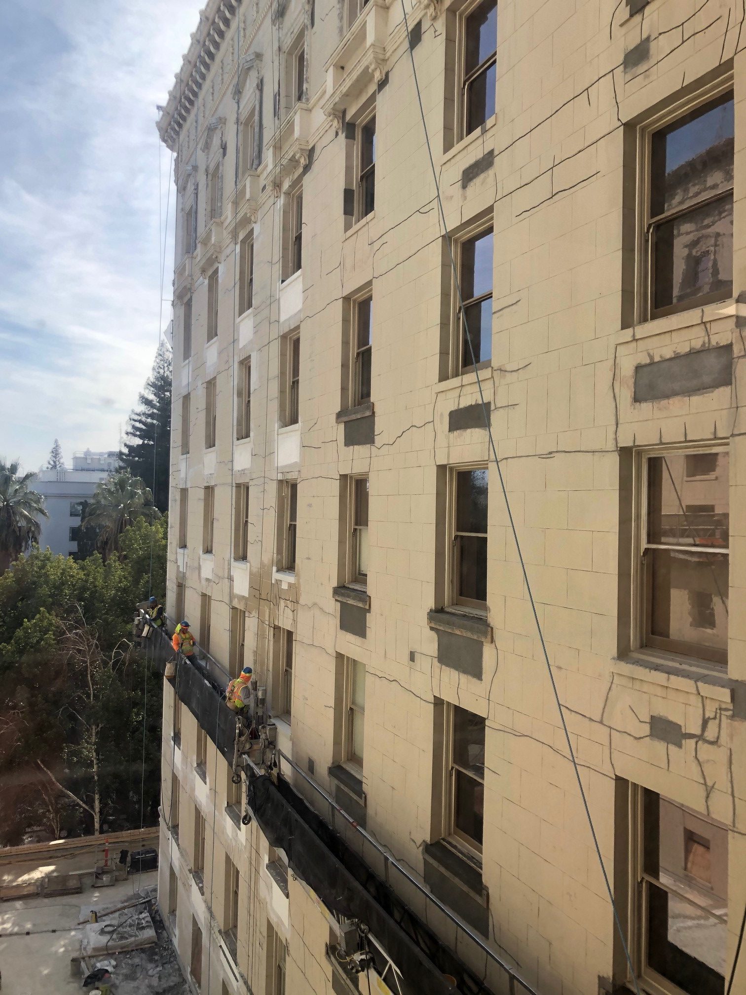The building was purchased by a new Owner, who wanted it restored to its original condition. In order to rehabilitate and repair the building, the concrete substrate, exterior cement plaster, ornamental precast elements, historic wood window assemblies, and the historic redwood flagpoles, as well as recoat all exterior façade elements needed to be restored.
