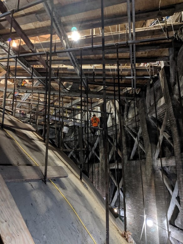 To access the inner dome and interior rotunda, the crew used a self-supporting scaffold that would not touch the inner dome to prevent further damage. The crew replaced the deteriorated clay tiles at the top of the supporting walls with concrete masonry units at the colonnade level.