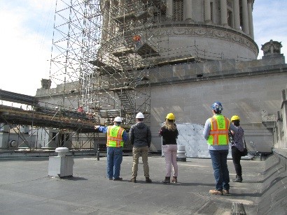 A field investigation was undertaken to determine the source of the water infiltration causing damage to the rotunda of the Capitol Building. The results of the investigation showed that the water infiltration started from the top of the gold dome. Based on the findings of the investigation, the State developed a repair project to address the conditions contributing to active bulk water infiltration, failed interior drainage systems, and subsequent damage to interior finishes. Ultimately, the State wanted to prioritize the safety, longevity, and historic preservation of the structure.